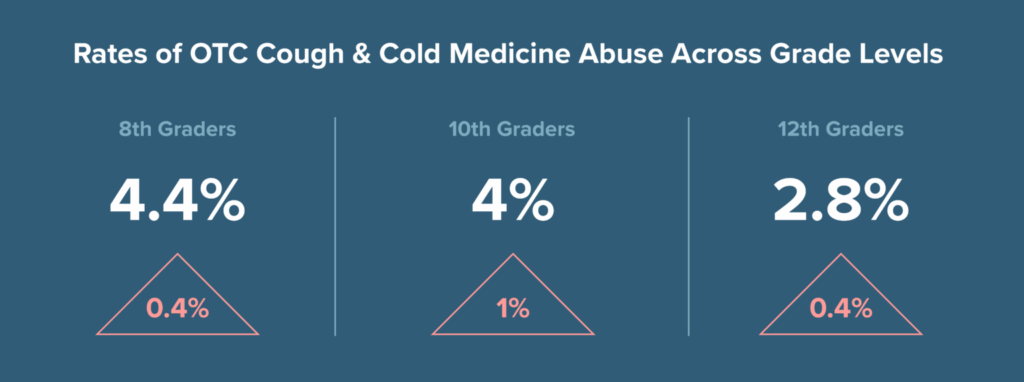 - Among eighth graders, the percentage of students who self-reported OTC medicine abuse rose year-over-year from 4% to 4.4%. It’s important to keep an eye on rates among this grade level, as we noted previously. The lowest rate of 2% was recorded in 2015, and the highest rate of 4.6% was reported in 2020.